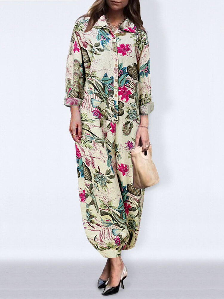 Leaves Floral Print Long Sleeve Vintage Jumpsuit For Women