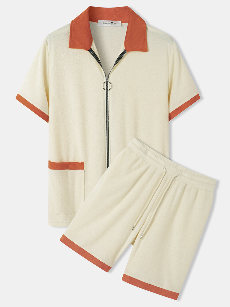 Mens Contrast Trims Patchwork Zip Front Towelling Street Two Pieces Outfits