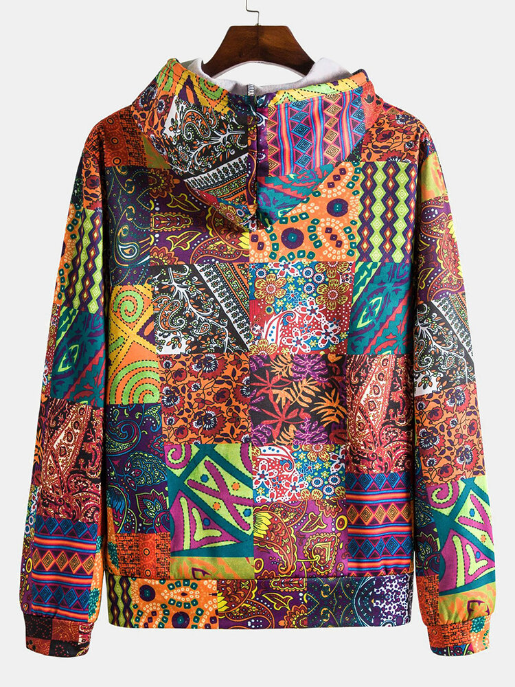 Vintage Patchwork Print Long Sleeve Drawstring Hoodie