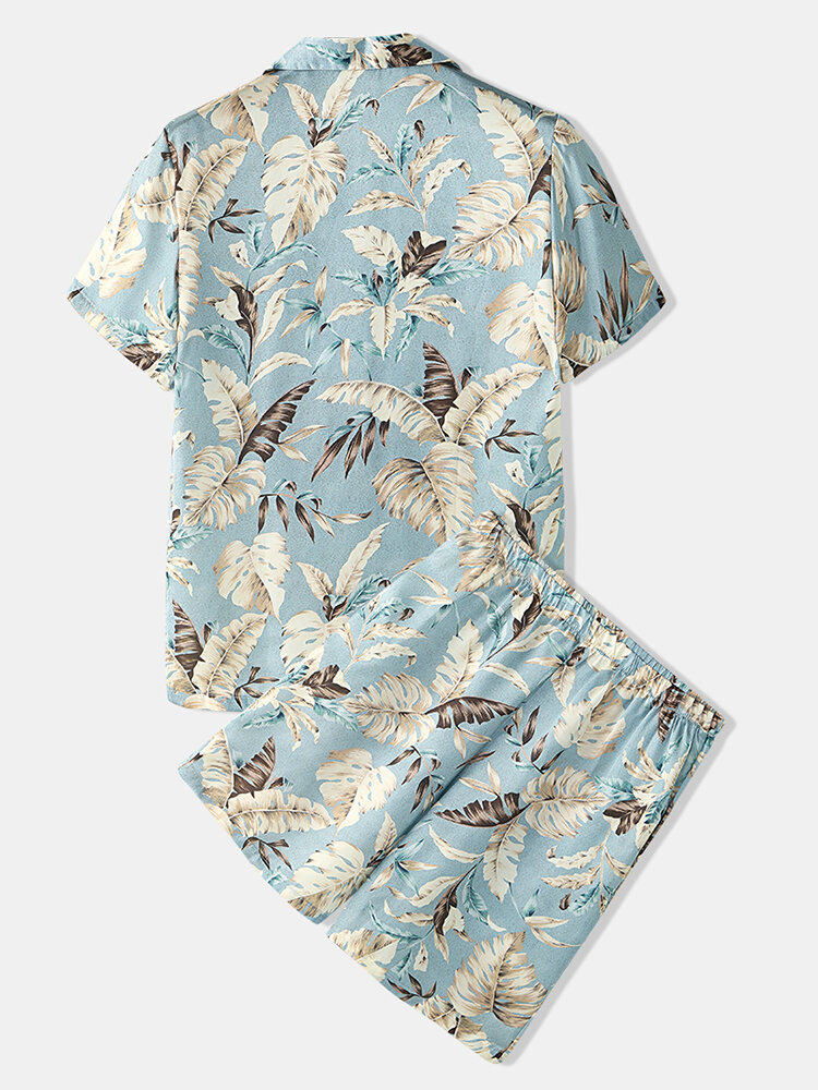Men Tropical Leaves Print Loungewear Two Pieces Faux Silk Pajamas Lapeal Collar Thin Sleepwear