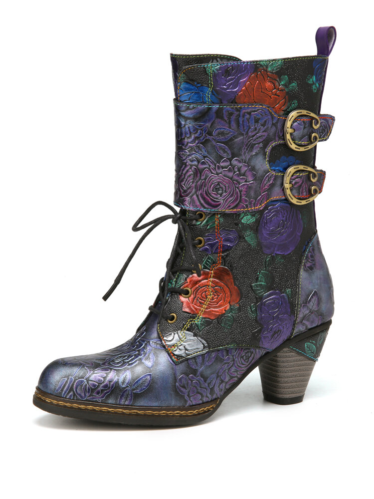 SOCOFY Vintage Floral Embossed Genuine Leather Warm Lining Casual Chunky Heel Boots