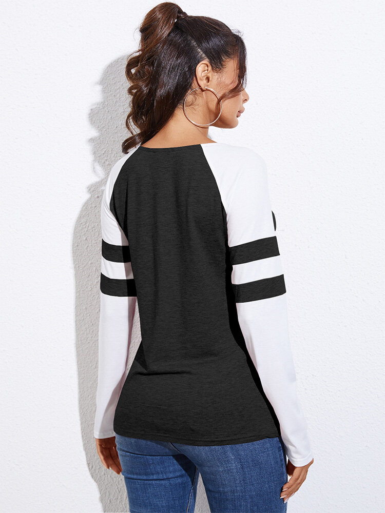 Contrast Color Zip Front V-neck Long Sleeve Casual T-shirt