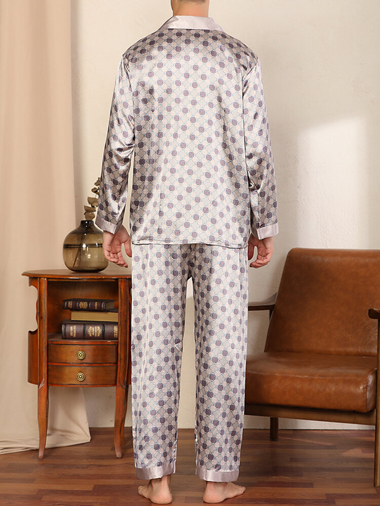 Geometric Faux Silk Home Loungewear Sets Two Pieces Long Sleeve Shirt Outfits For Men