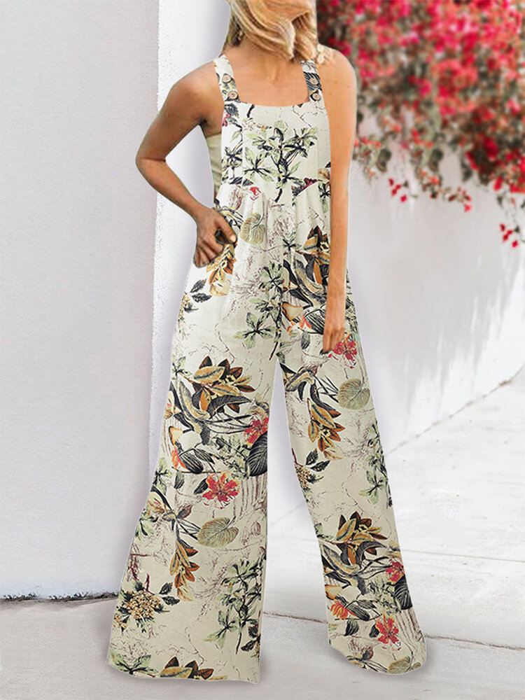 Floral Print Wide-legged Pockets Straps Sleeveless Jumpsuits For Women