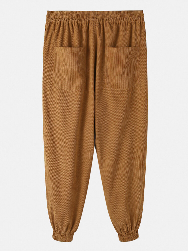 Mens Corduroy Solid Color Loose Fit Simple Elastic Cuff Drawstring Jogger Pants