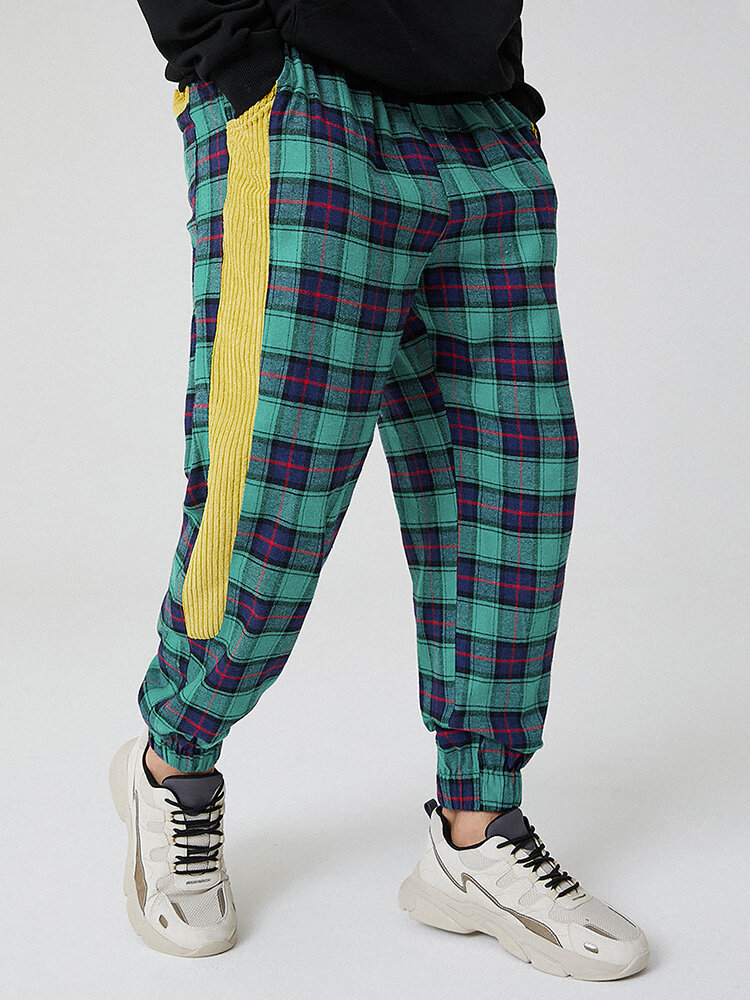 Mens 100% Cotton Check Side Patchwork Casual Drawstring Jogger Pants