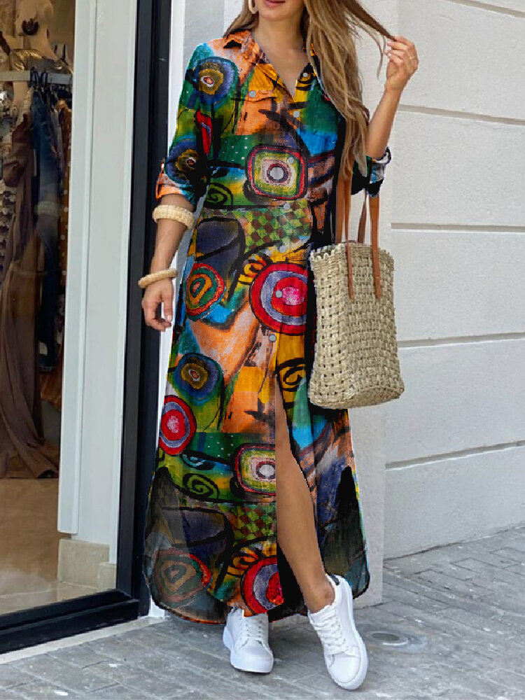Print Long Sleeve Lapel Button Plus Size Dress with Pocket
