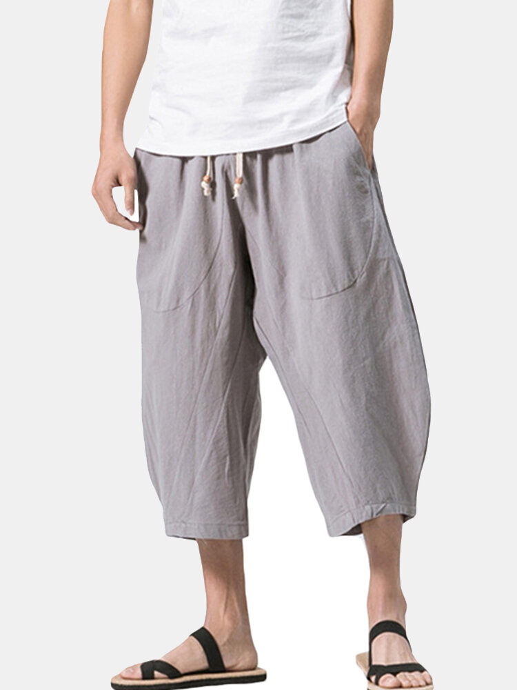 Mens Summer Breathable Cotton Linen Solid Color Calf Length Baggy Loose Drawstring Casual Shorts