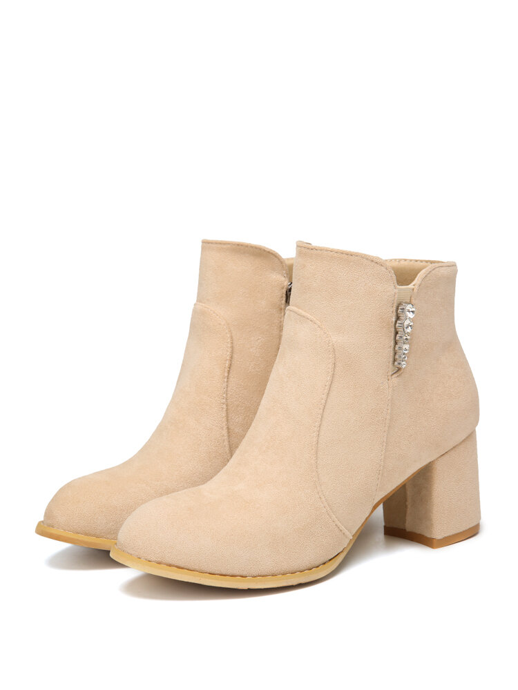 Women Suede Rhinestone Almond Toe Side Zipper Chunky Heel Ankle Boots
