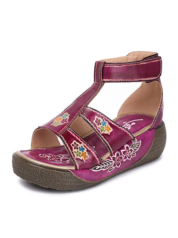 SOCOFY Flowers Print Genuine Leather Ankle Strap Hook Loop Comfy Wearable Platform Sandals