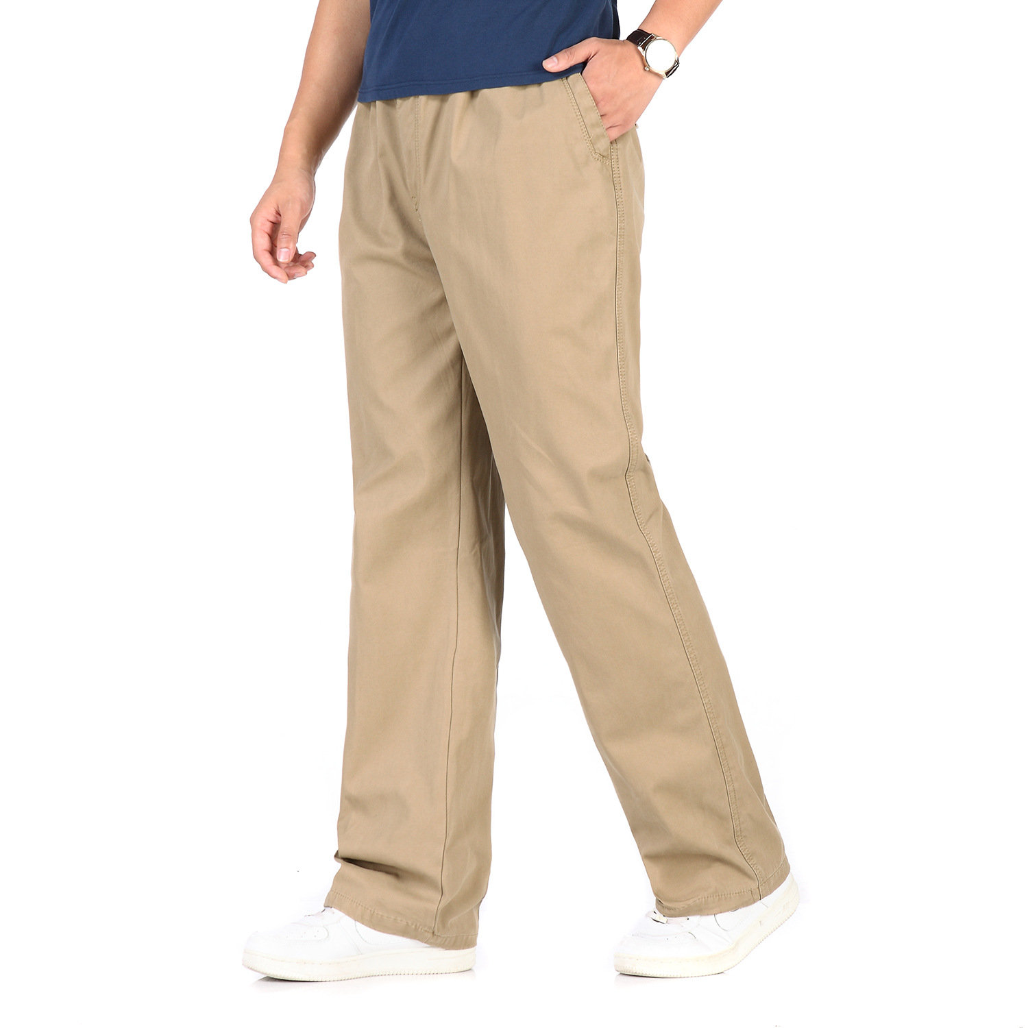 Mens Loose Breathable Elastic Waist Design Straight Solid Color Casual Pants