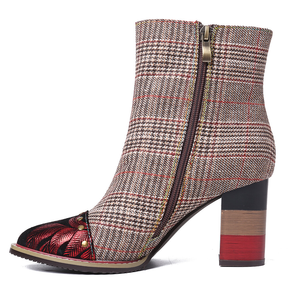 SOCOFY Grid Pattern Fashion Bead Sheep Leather Splicing High Square Heel Short Boots