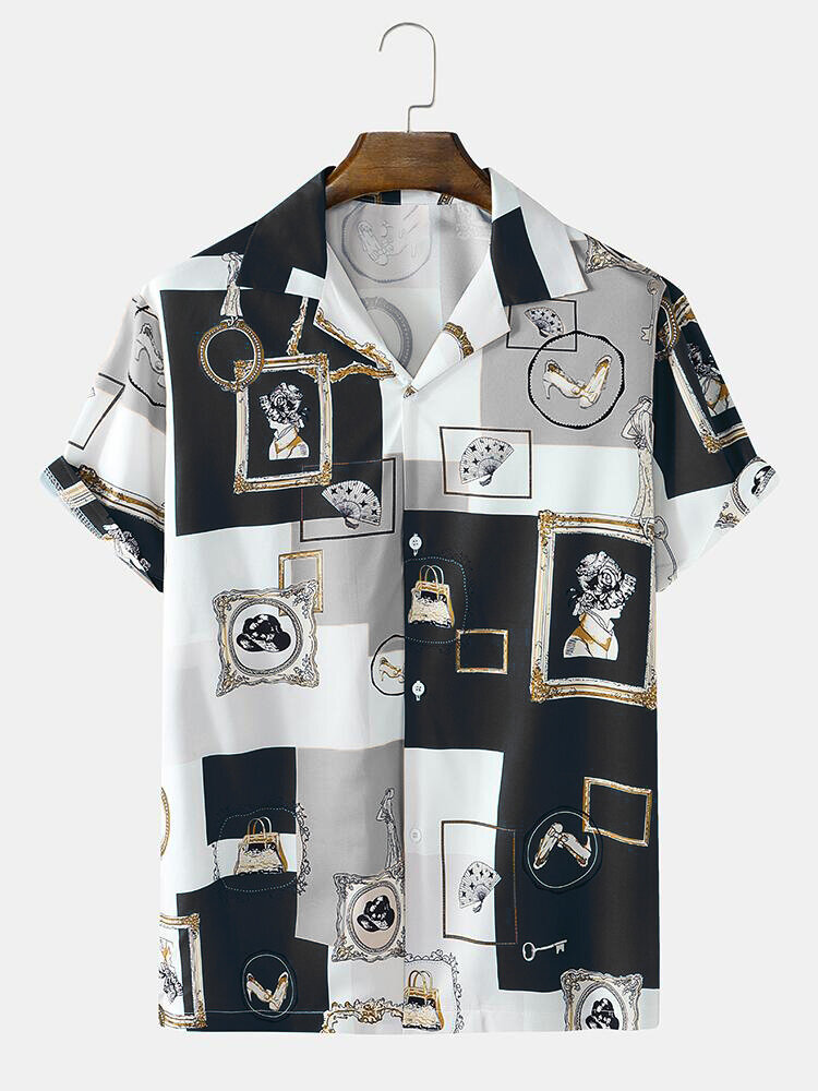 Mens Baroque Color Block Printed Revere Collar Vintage Short Sleeve Shirts