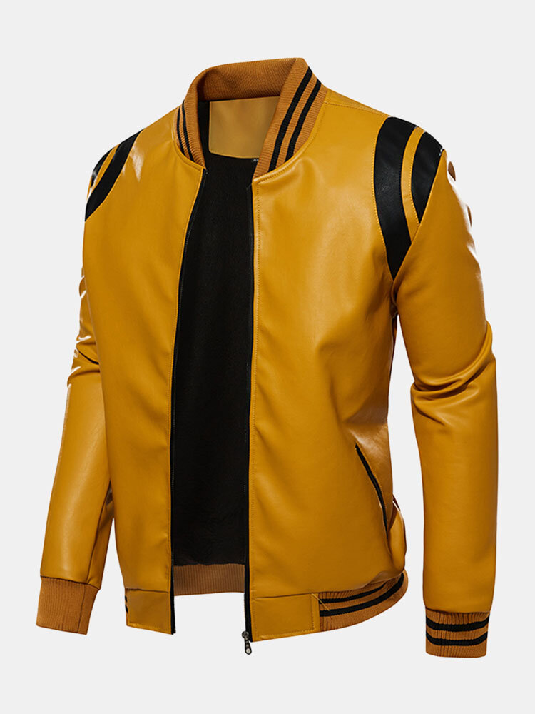 Mens Contrast Baseball Collar PU Leather Zipper Design Casual Jackets